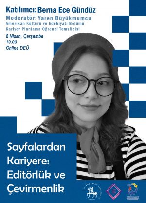 📢 Berna Ece Gündüz’ün katılımı ile “Sayfalardan Kariyere: Editörlük ve Çevirmenlik” webinarımız 8 Nisan, Çarşamba günü saat 19.00’da online şekilde Sakai üzerinden gerçekleşecek.